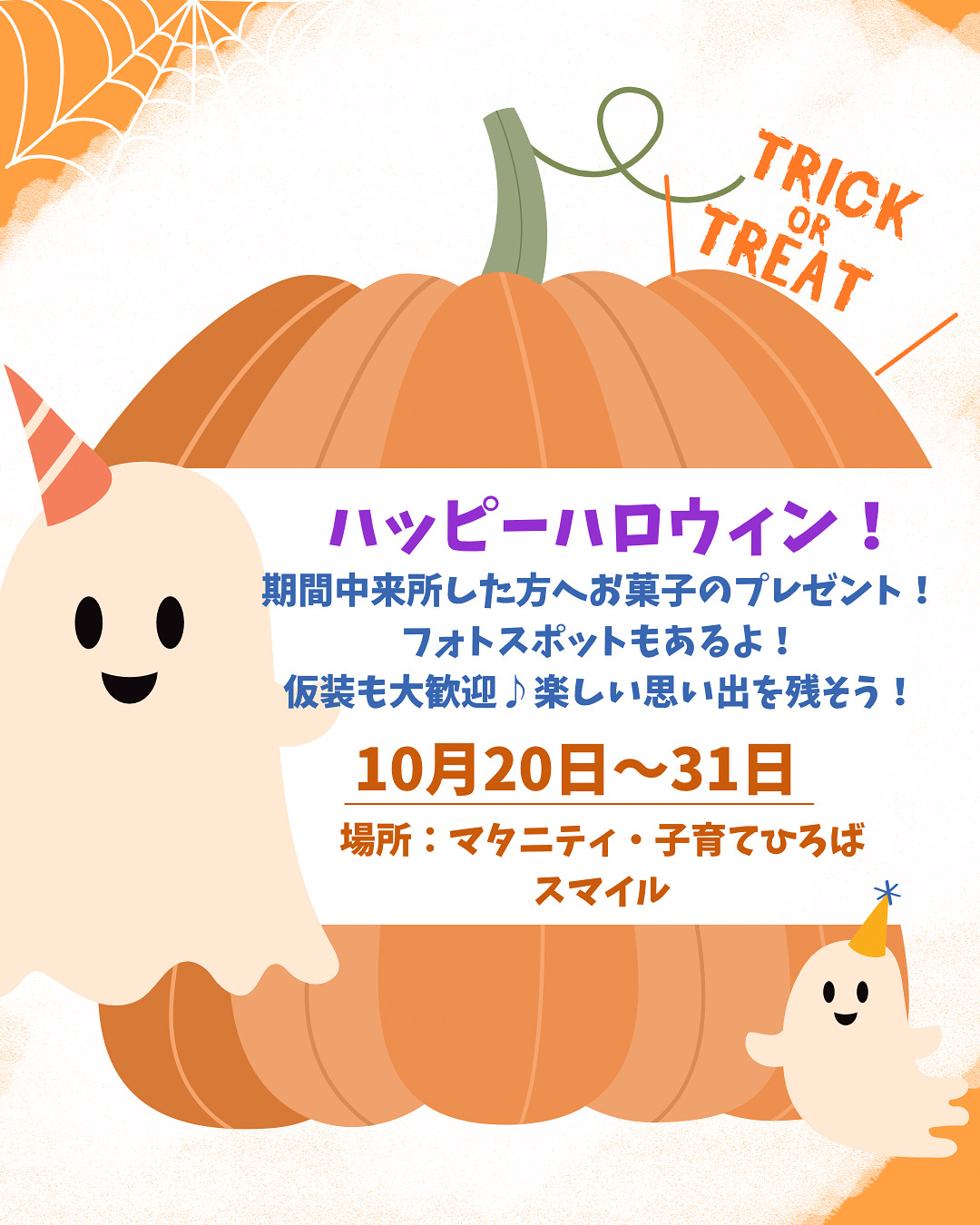 スマイル 2025.10.17 子育てひろばスマイル🎃ハロウィンイベント マタニティ・子育てひろばスマイルからのお知らせです! 10月20日(月)〜31日まで、ハロウィンウィークを開催します!🎃 来所してくれた方へお菓子のプレゼントや、フォトスポットもありますよ✨ 仮装を楽しむのも大歓迎です👻🎃 ぜひみんなでハロウィンを楽しみましょう〜✨ 予約は不要です! ぜひあそびにきてねー!🌈 マタニティ・子育てひろばスマイル 住所:石巻市蛇田字土和田19-11 お問い合わせ ベビースマイル公式LINE または0225-98-5322まで 前の記事次の記事一覧へ戻る
